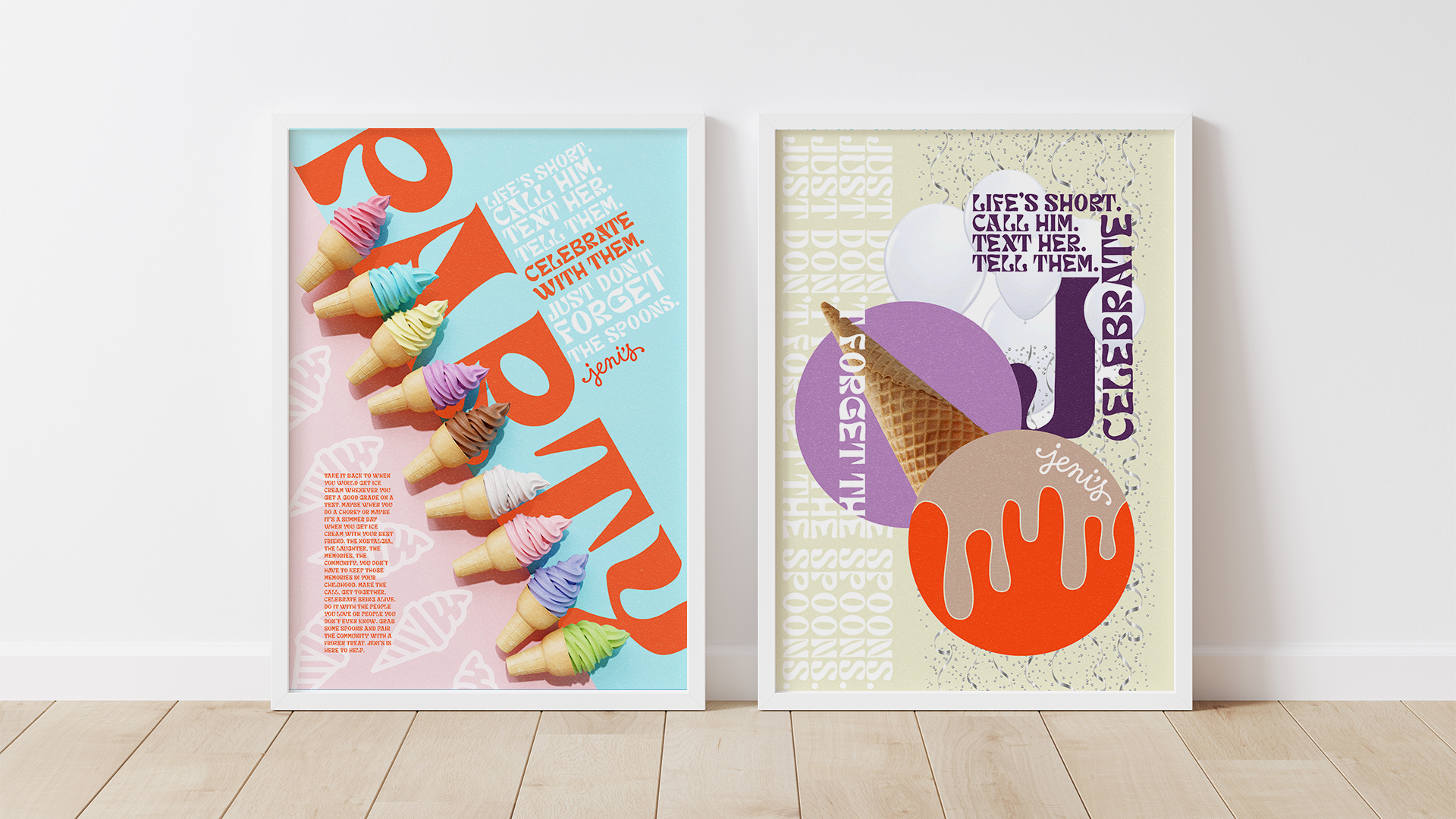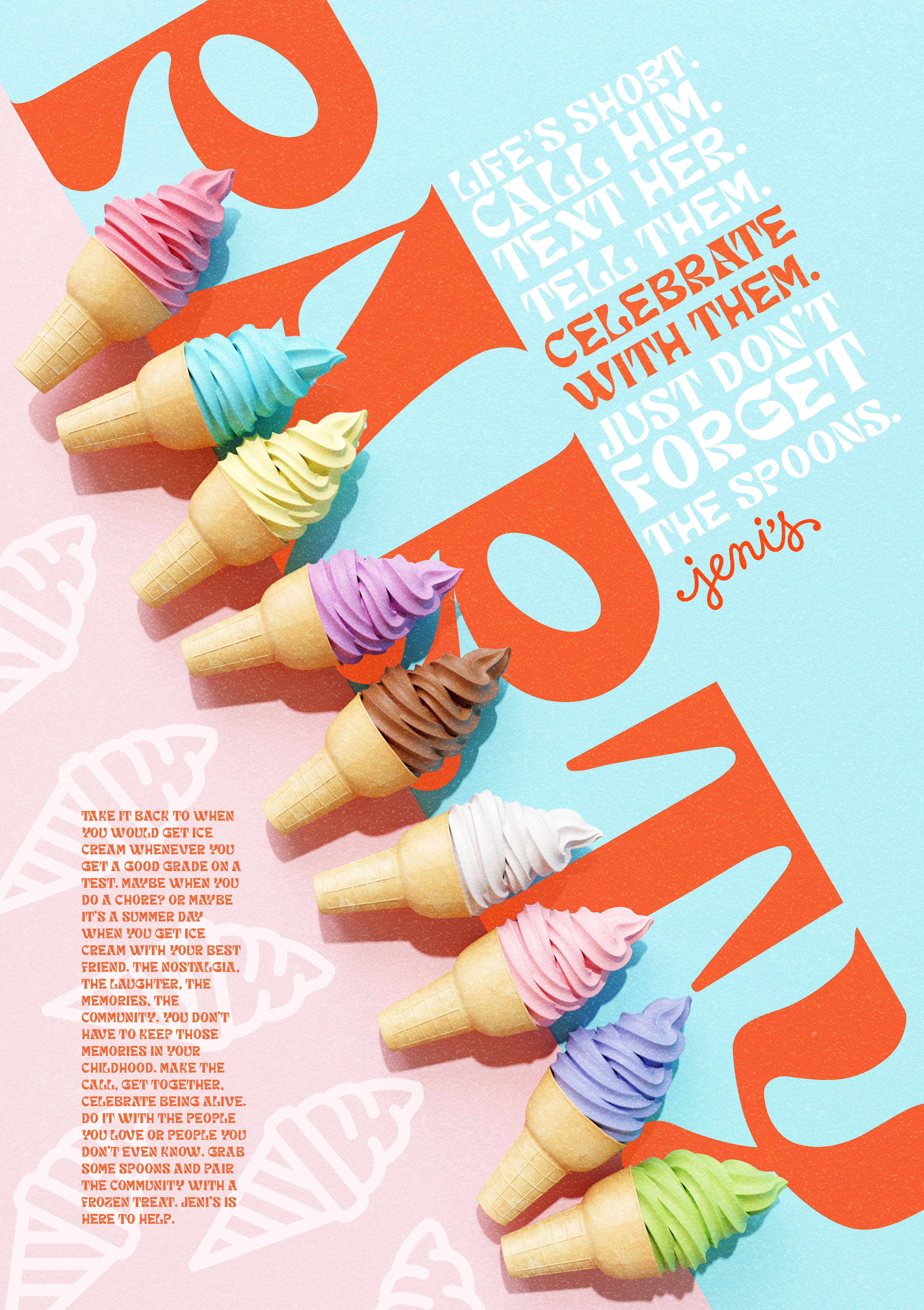 The task was to create two posters; one focused on photography and the other on typography. It was to highlight a food experience which I chose to do through a Jeni's ad that shows the importance of celebration and community.
